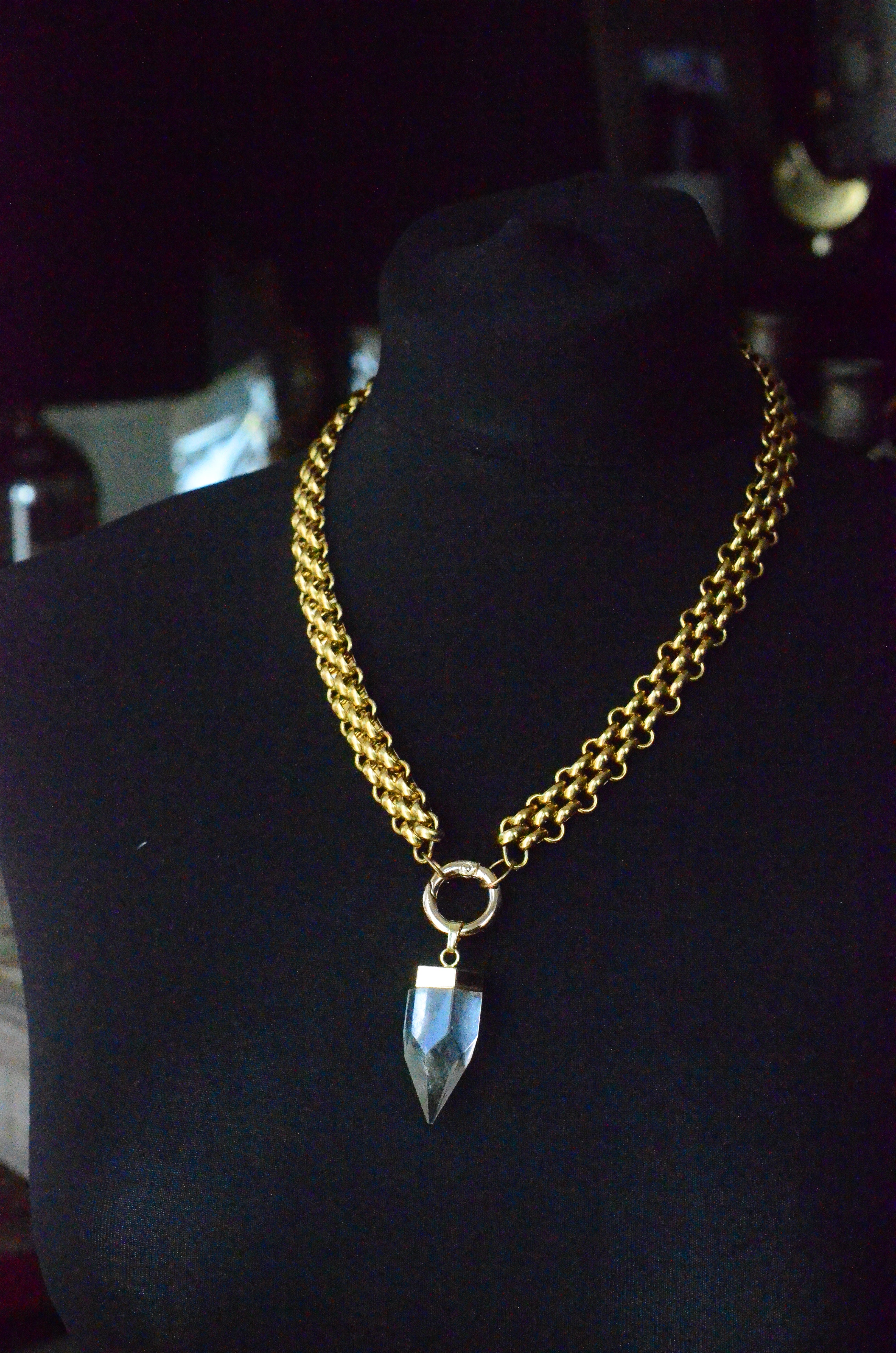 A beautiful clear crystal quartz pendant hangs from a gold coloured stainless steel chain. The trigger ‘O’ clasp allows for the pendant to be interchangeable to suit your mood!