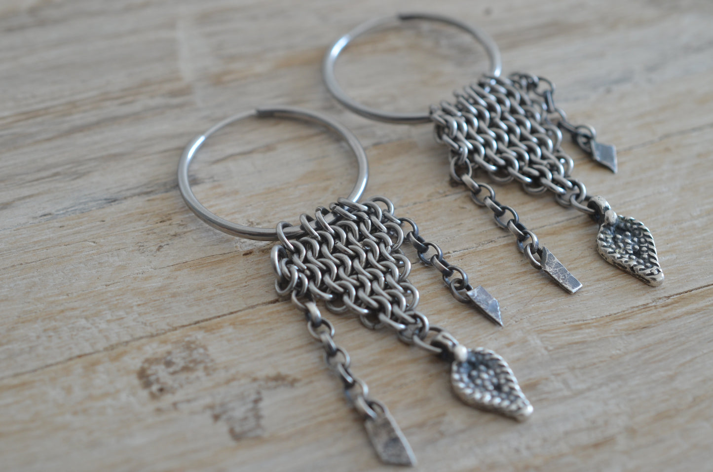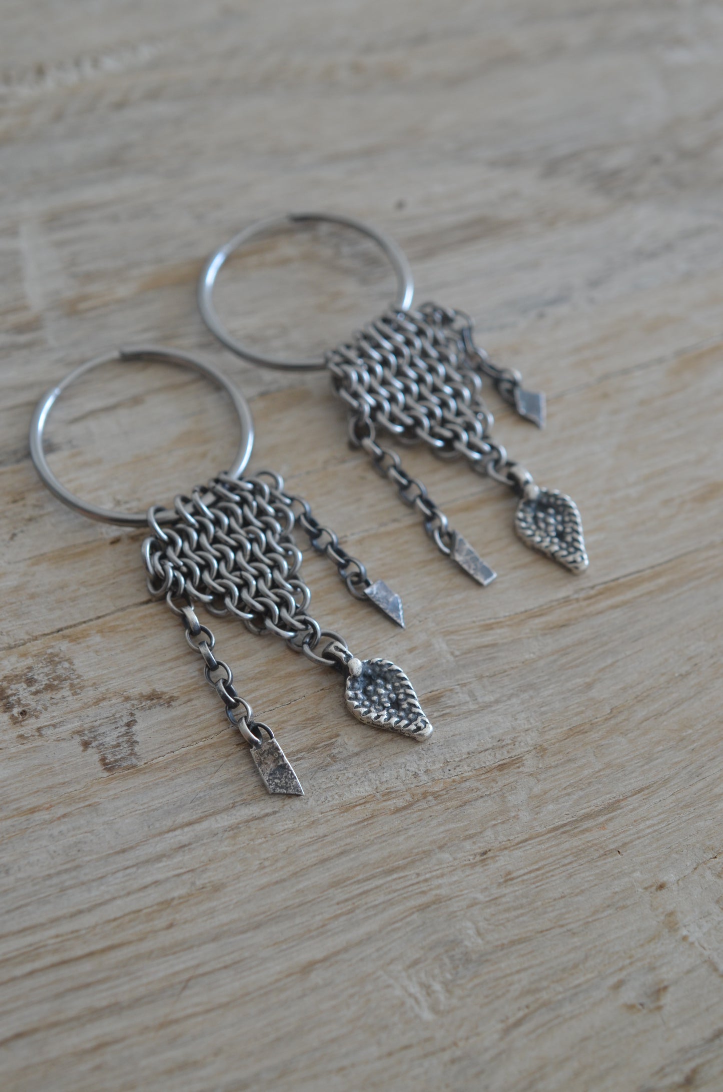 Meticulously woven from stainless steel chainmaille, each hoop echoes the protective grace of historical armor, while shimmering sterling silver accents bring a touch of refined elegance. The result is a bold yet timeless piece — a perfect balance of strength and sophistication.