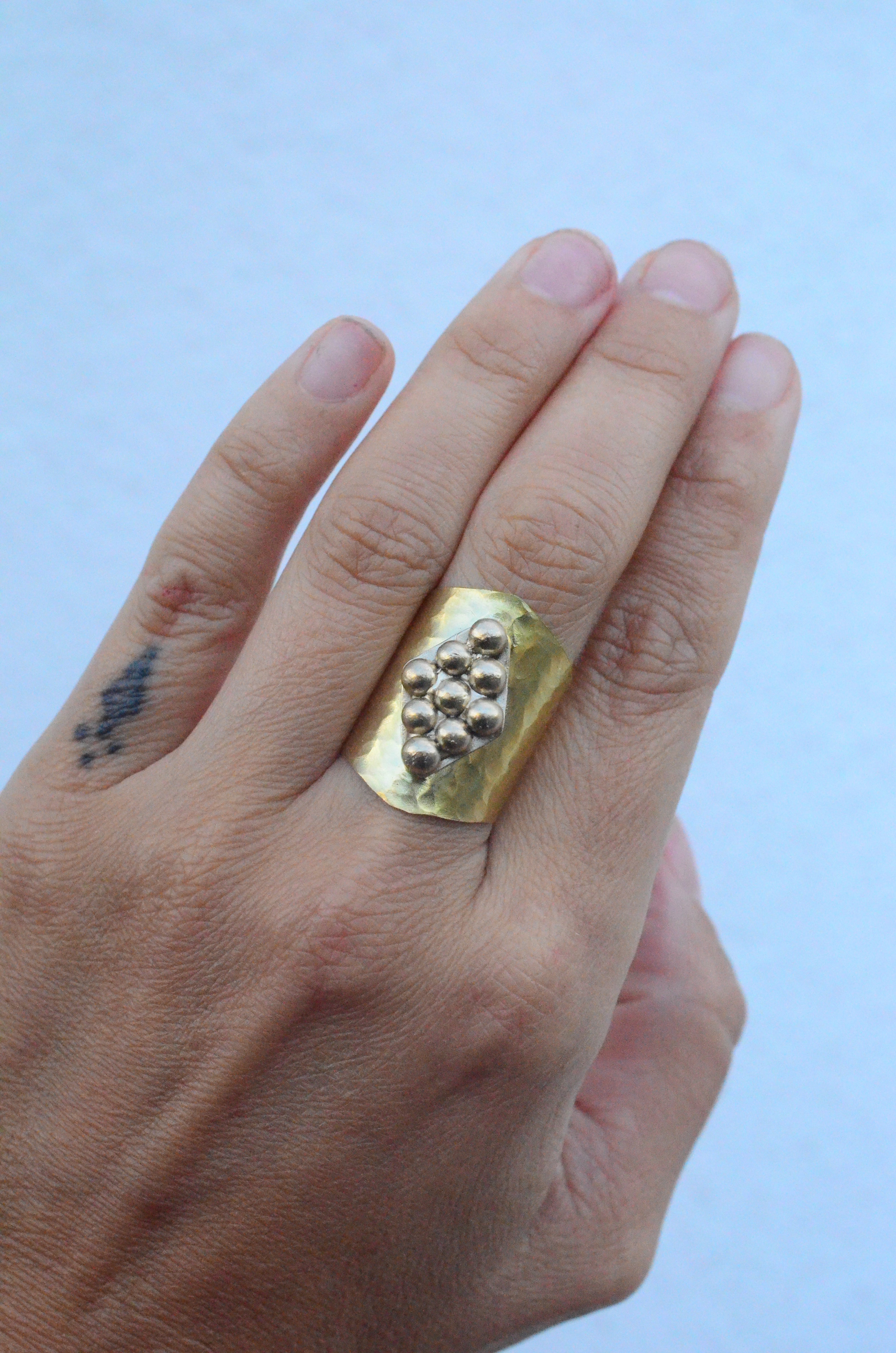 Make a statement with this bold, artisan-crafted sheild ring. Hand-forged from warm, golden brass, this wide band is beautifully hammered to catch the light from every angle. The focal point features delicate granulation detailing, adding texture and visual intrigue to the piece. The adjustable band ensures a comfortable, customizable fit, making it perfect for everyday wear or as a standout accent for special occasions. Fits size UK L - M