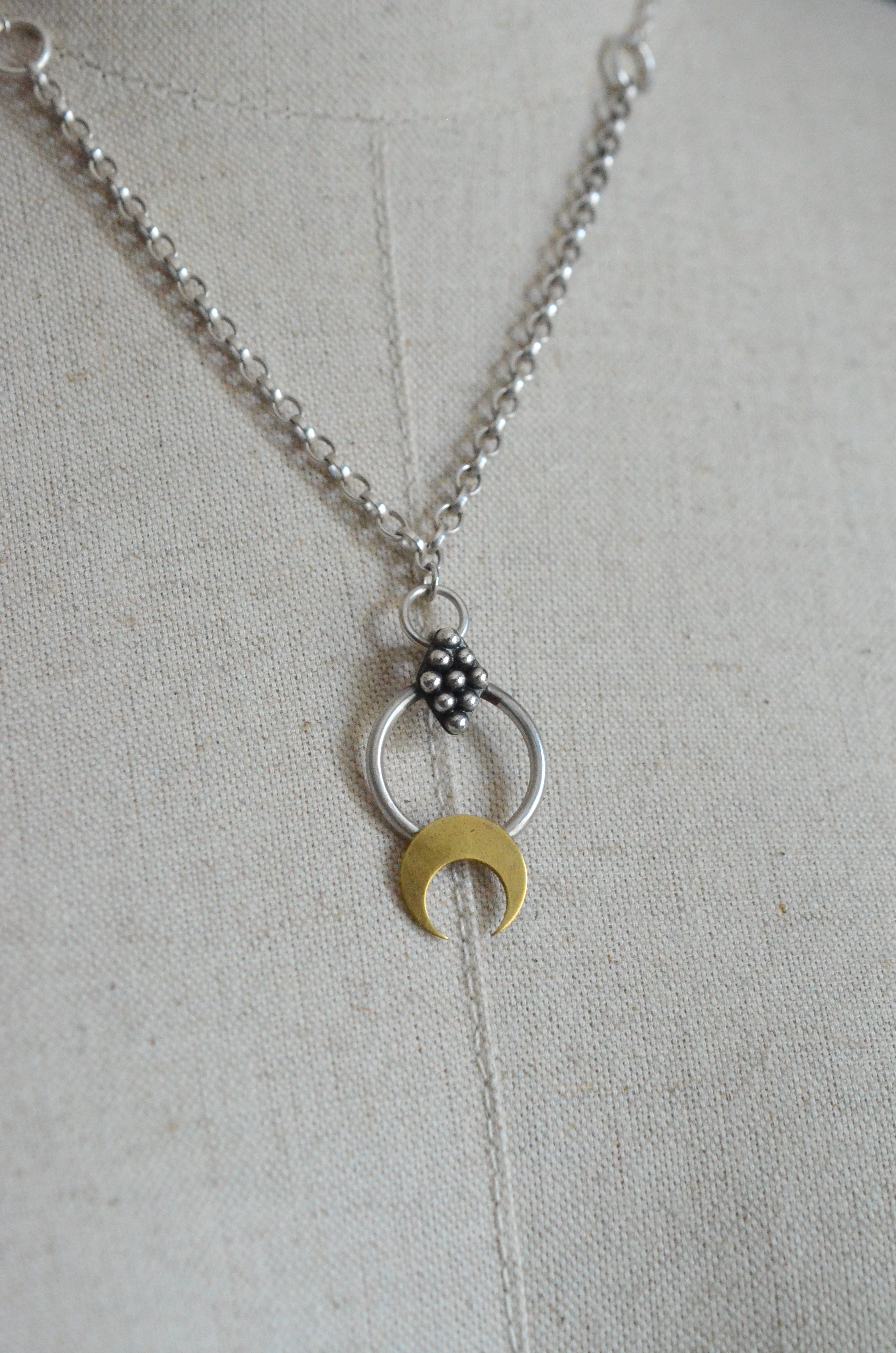 Celebrate balance and beauty with this elegant mixed-metal necklace. Handcrafted from solid sterling silver, it features a striking brass crescent moon pendant, symbolizing intuition, growth, and new beginnings. The warm golden tones of the brass contrast beautifully with the cool sheen of silver, creating a piece that feels both modern and timeless.